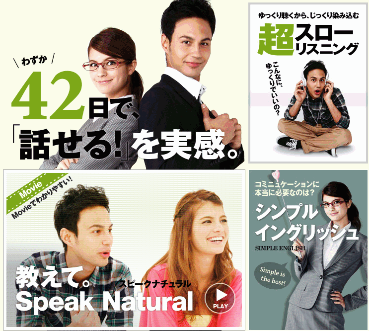 最近楽天やユニクロの社内公用語を英語にするといったニュースを耳にした 人も多いと思いますが、実はビジネスの世界だけではなく、20〜34歳の働く 女性を対象にしたアンケート「2010年度 人気おケイコランキング」によると、 2010年に「経験した習い事」の1位は3年連続で「英語」、また、「これから やってみたい習い事」の1位も3年連続で「英語」でした。 これからますます英会話学習の需要は拡大します。初心者がまず英語で『会話』 するために必要な最小限のパッケージ、それが「スピークナチュラル」です